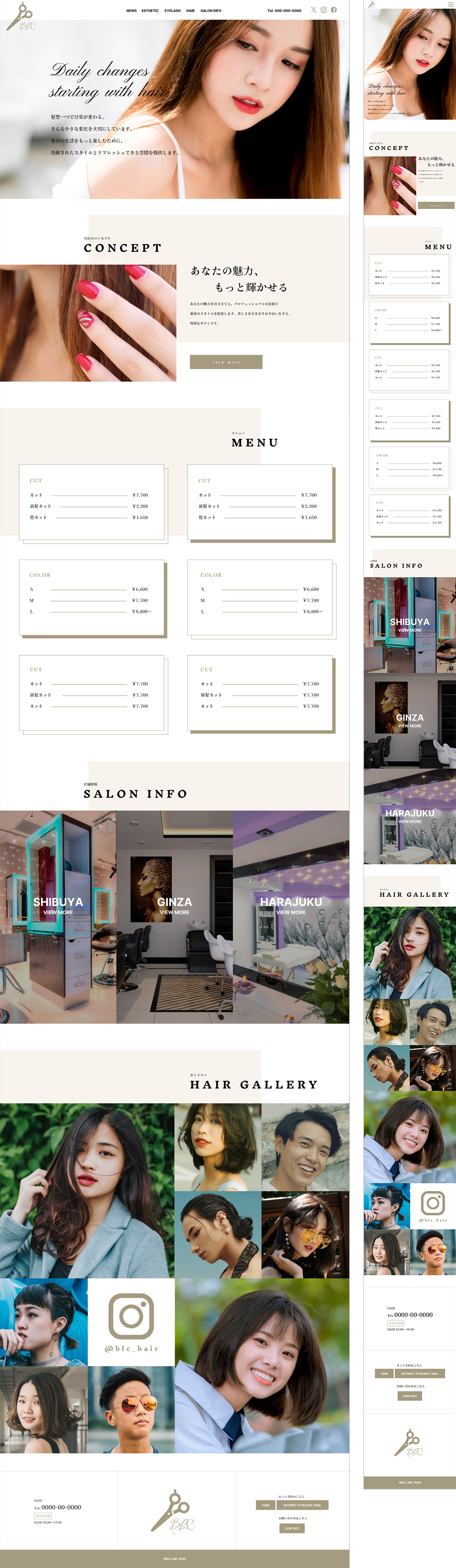 「figma」の練習も兼ねて、美容室の架空サイトをデザインしました。フリーランスのデザイン業でカフェなどの案件を受けたことはありますが、これまで携わってこなかった業種のデザインという事もあり、色の統一感や美容室の落ち着いた雰囲気を感じさせるようなテイストで仕上げました。