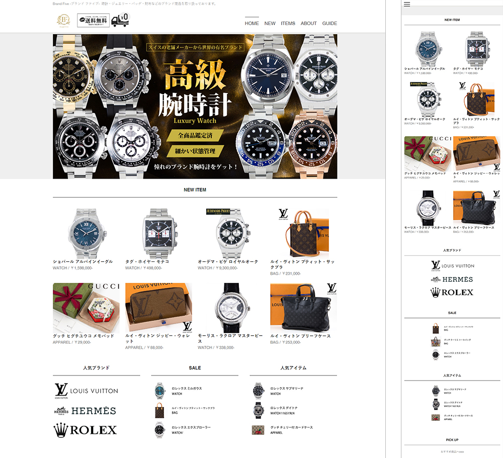 高級時計を主としたブランド品のECサイトの制作をしました。尚、元々展開していたYahoo!ショッピングにリンクするフロントページのような構成になっております。